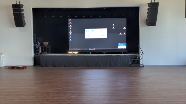 මුලින් පාරිභෝගිකයා වේදිකාවක් මත කදම්බයේ එල්ලා තැබිය හැකි තිරයක් තිබීමට අදහස් කර ඇත, තත්පරයකට පසුව සිතා බැලීමෙන් පසුව වේදිකාවේ බිම ගොඩ ගැසිය හැකි බිත්තියක් සෑදීමට වැඩි ඉඩක් ඇත. රෝද සහිත චලනය කළ හැකි වරහනක් තැනීමට අපි නිර්දේශ කළෙමු. තිරය කෙළින්ම බිම සිටගන්නවාට වඩා වරහන් ව්යුහය ගොඩගැසී ඇත. මෙම විසඳුමේ වාසිය නම්, ලීඩ් බිත්තිය විසුරුවා හැරීමකින් තොරව වේදිකාවේ ඕනෑම ස්ථානයකට නිදහසේ ගමන් කළ හැකි වීමයි.