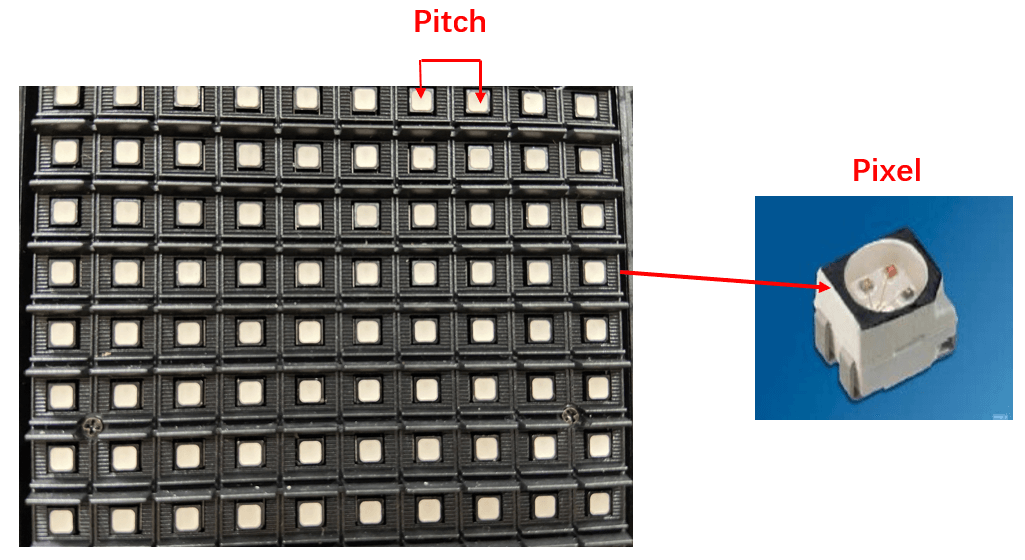 පික්සලයක් යනු LED මොඩියුලයක හෝ LED තිර රූපයක කුඩාම පොකුර වන අතර, සෑම පොකුරක්ම වර්ණ 3 LED වලින් සමන්විත වේ, එක් රතු, එක් කොළ සහ එක් නිල්, පික්සලයක් දක්වයි.