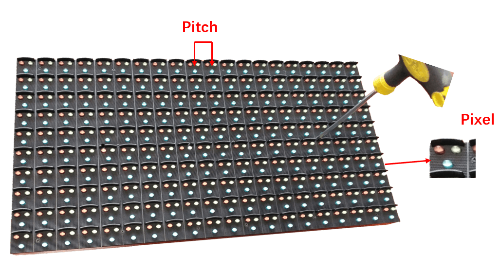 LED පොකුරු වල දුර ප්රමාණය මත පදනම්ව LED සංදර්ශකයක විභේදනය ගණනය කිරීම සඳහා LEDsign කර්මාන්තය මිලිමීටරයෙන් මිනුම් කරන පික්සල් පිච් එක සම්මතයක් ලෙස භාවිතා කරයි - පික්සෙල් ලෙසද හැඳින්වේ.